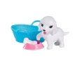 Elle est accompagnée de son animal de compagnie et de plusieurs accessoires pour prendre soin de lui.